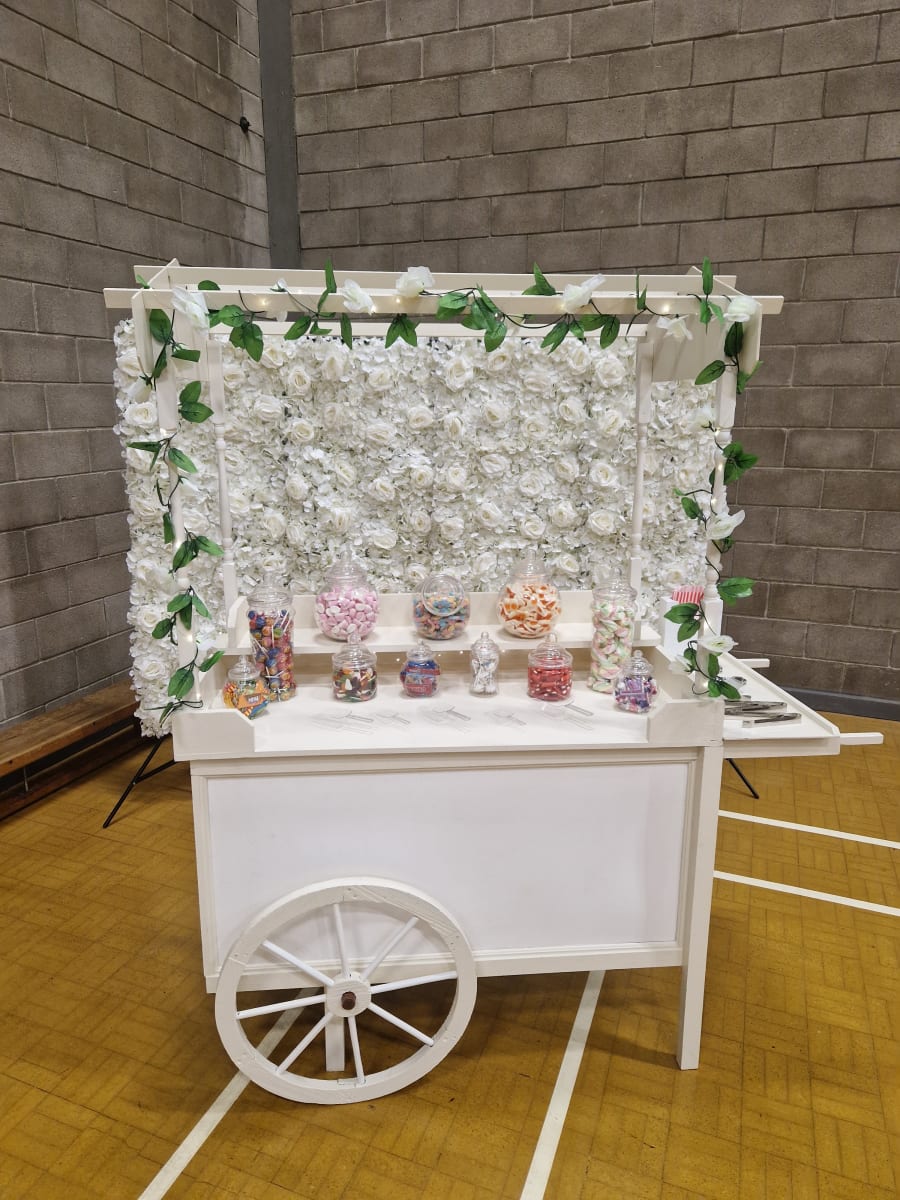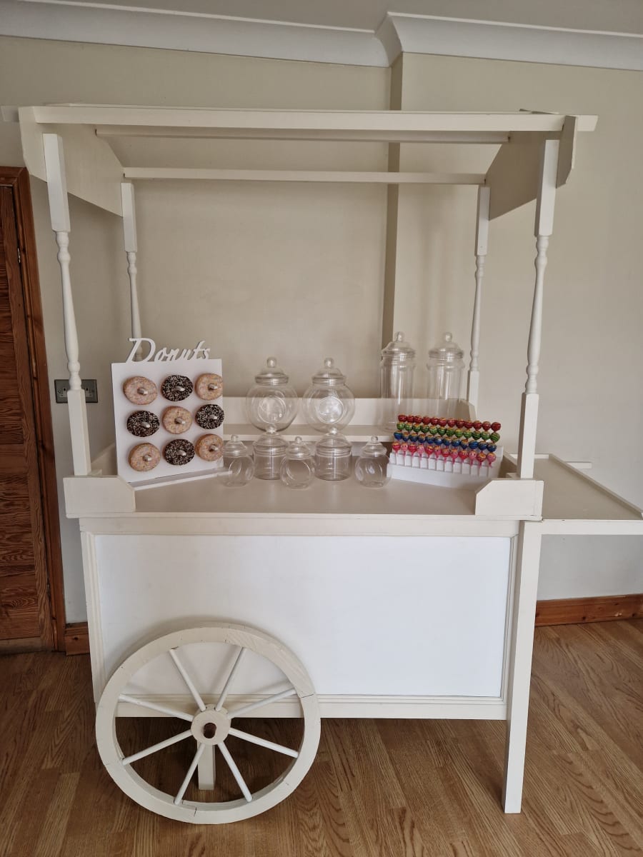 Perfect for any event including weddings, christenings, baby showers and more, this full size sweet cart will be a hit with guests of all ages. Available plain or with decorations that can be customised to your colour scheme. Also wheel can be wood effect or white to match venue as needed.